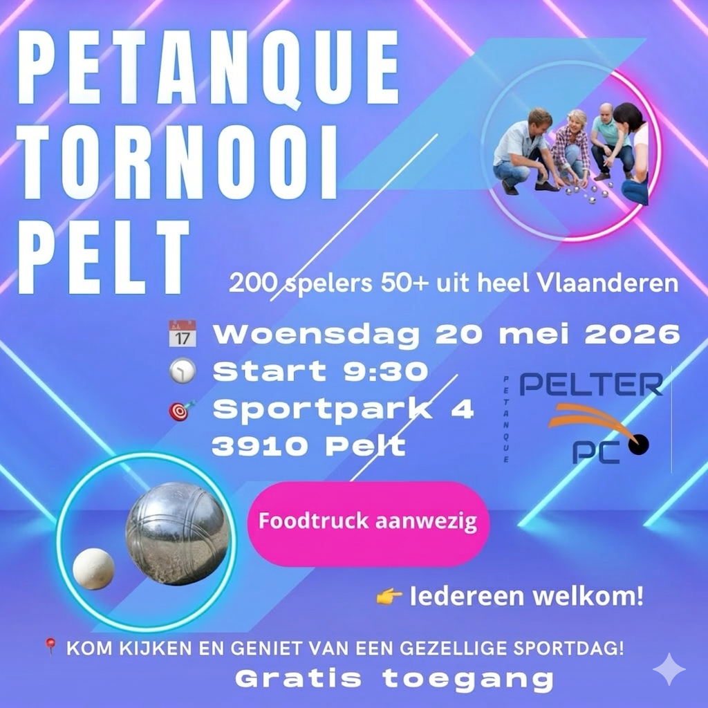 De Pelter Petanque Club organiseert op woensdag 20 mei 2026 een groot V.I.B.-petanque tornooi in Pelt. Voor dit evenement worden ongeveer 200 spelers van 50 jaar en ouder verwacht uit verschillende clubs uit heel Vlaanderen.
